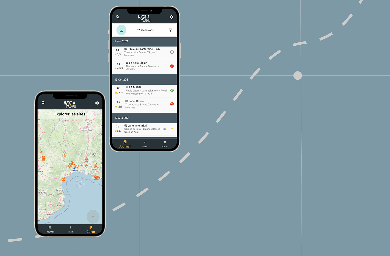 Not a Topo ne s'arrête pas là : les outils intégrés de journal de bord et d'exploration vous permettent d'être pleinement accompagné tout au long de vos escapades, de la recherche de site jusqu'au pied de la voie.
